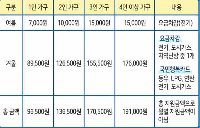 여름에는 전기요금 겨울에는 전기와 도시가스를 사용하는 분들을 지원하고 있습니다.