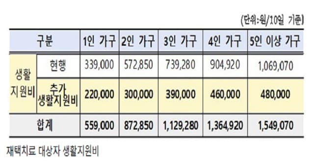가구원수를 기준으로 생활지원비 지급