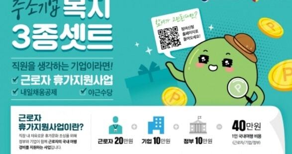 20만원 적립하고 20만원 추가지원하는 근로자 휴가지원사업을 신청해보세요. 국내여행 캠핑용품 외식상품 구매 가능하다고 하네요.