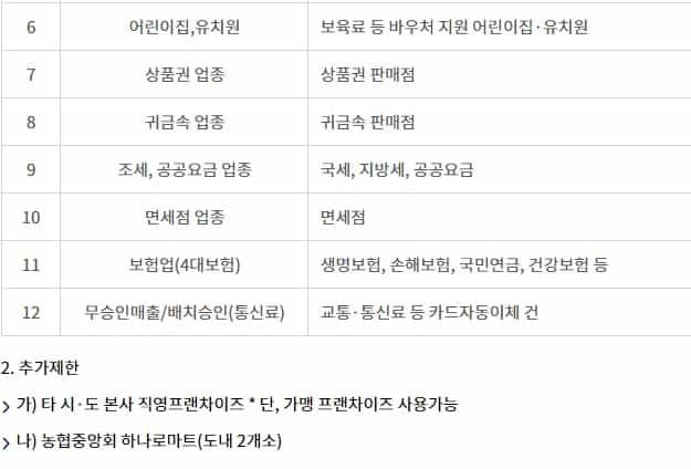 - 제한 업종 : 20년 1차 국가재난지원금 지급제한 12개 업종과 동일/ 타시도 본사 직영 프랜차이즈 가맹 프랜차이즈/ 농협중앙회 하나로마트 도내 2개소