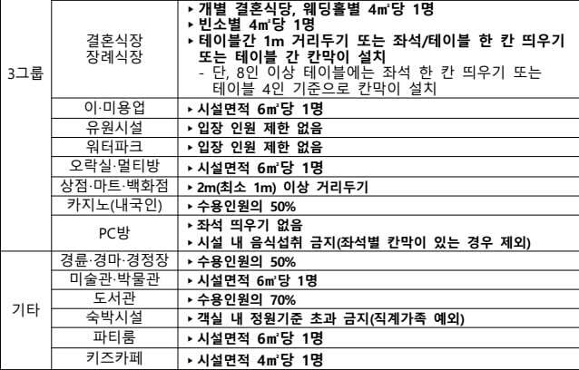 - 예외적용 : 1차 이상 접종자 실외 다중이용시설 인원 제한 제외/ 완료자는 실내 다중이용시설 인원 제한에서 제외
