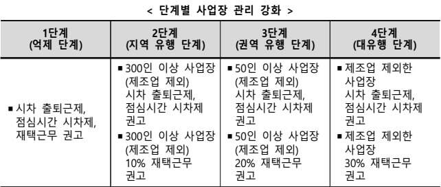 - 구내식당 : 투명 가림막 설치 또는 일렬 지그재그 식탁 배치/ 2단계 부서별 점심시간 시차운영/ 3단계 식사시 대화 금지