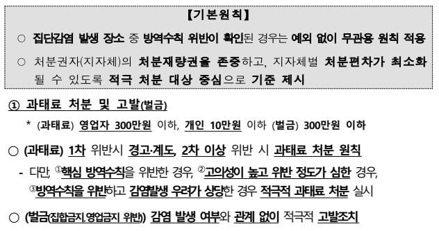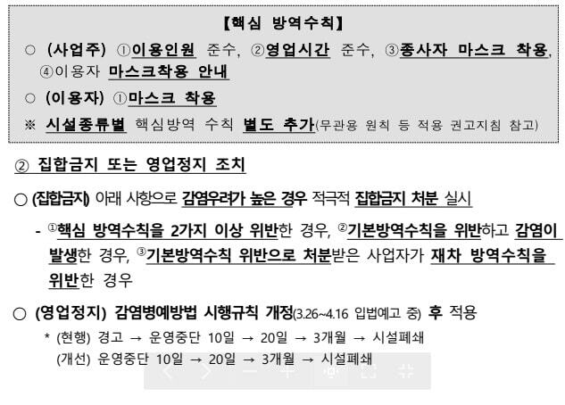 방역수칙 위반시 지자체 관태료 부과와 별개로 지자체 해당시설 2주간 짖ㅂ합금지 명령 강화