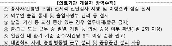 - 1일 2회 발열체크 감염관리 담당자 지정 외부인 출입 자원봉사자 관리강화