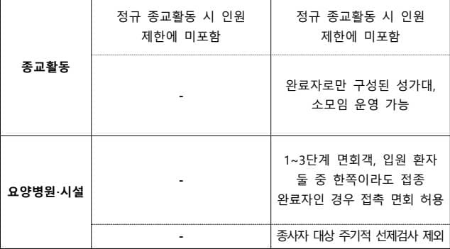 - 백신 접종자 1차 접종자 포함 전규 종교활동 시 수용인원 기준 제외, 예방접종 오나료자로만 구성된 성가재 소모임 운영가능