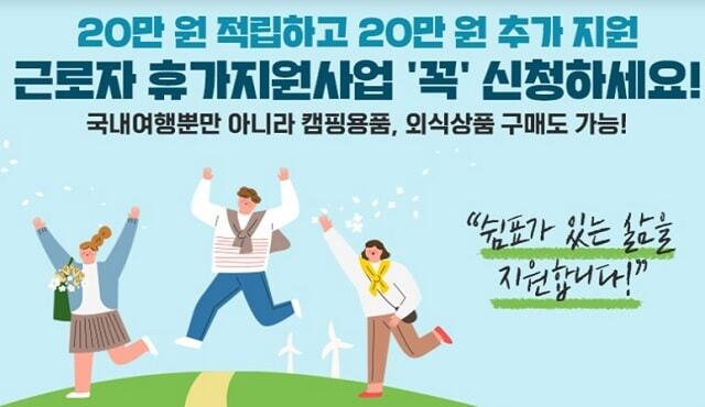 20만원 적립하고 20만원 추가지원하는 근로자 휴가지원사업을 신청해보세요. 국내여행 캠핑용품 외식상품 구매 가능하다고 하네요.